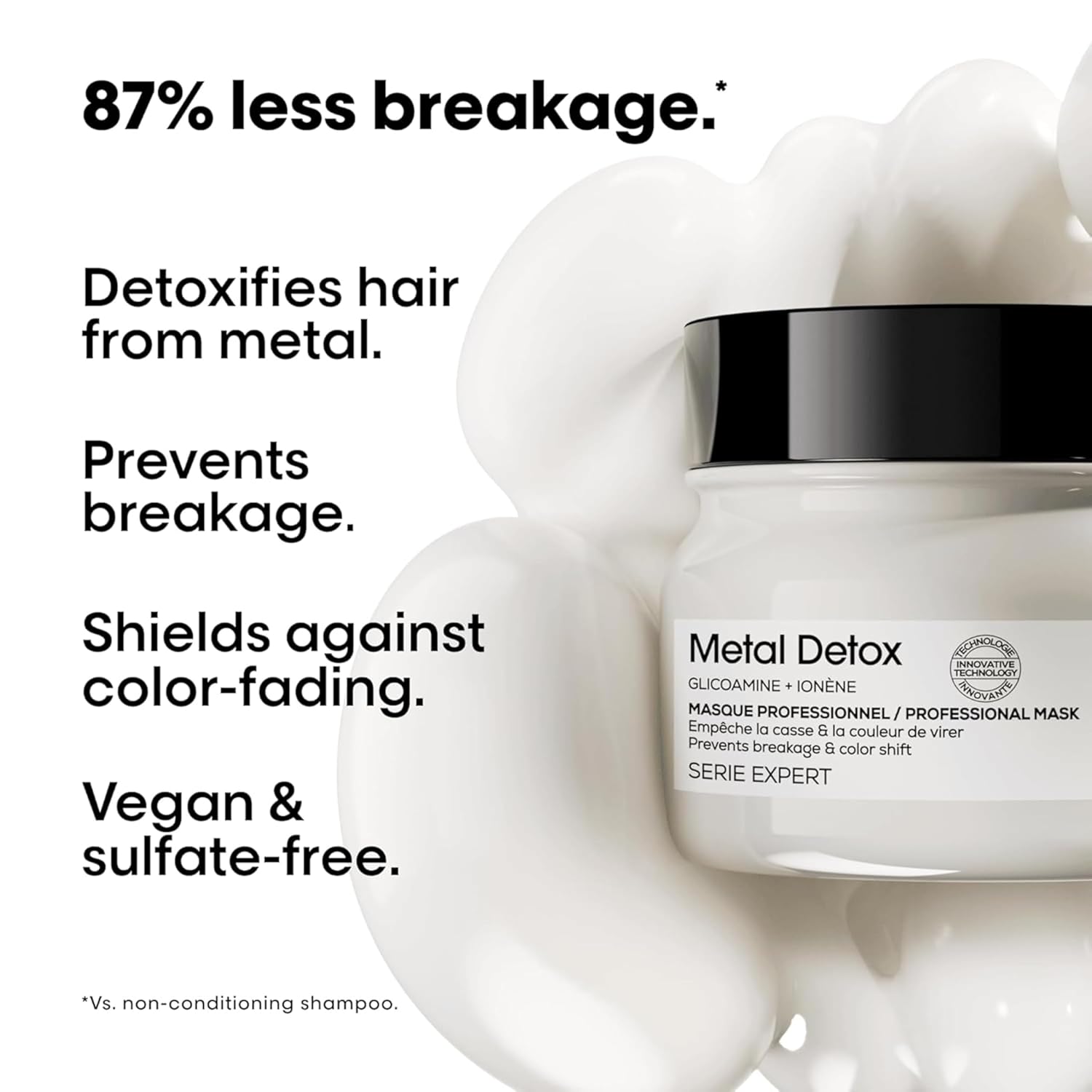 Su fórmula cremosa nutre en profundidad sin aportar peso, dejando el cabello más suave, brillante y resistente, al mismo tiempo que prolonga la intensidad y uniformidad del color. Trabaja en sinergia con el shampoo Metal Detox para completar el ritual de desintoxicación del cabello después de servicios químicos.