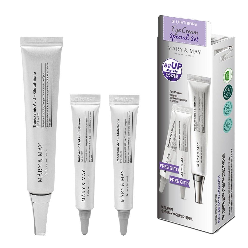 Mary&May - Tranexamic Acid + Glutathione Eye Cream está diseñado para tratar intensamente las ojeras y la hiperpigmentación del contorno de los ojos. Contiene una potente mezcla de ácido tranexámico y glutatión, conocidos por sus propiedades antioxidantes y su capacidad para iluminar el tono de la piel y mejorar su color desigual. Esta crema para el contorno de ojos está especialmente formulada para reducir la producción de melanina y combatir los radicales libres, lo que se traduce en un tono de piel más radiante y uniforme alrededor de los ojos.
