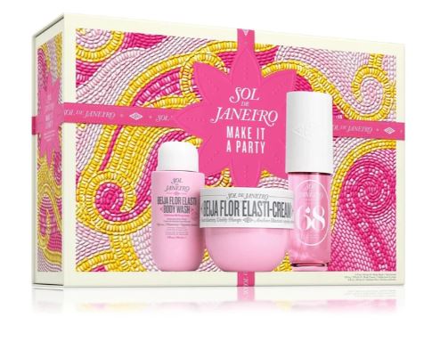 Sol de Janeiro Make It a Party Set es un kit corporal edición limitada con aroma Cheirosa 68, ideal para regalar o para quienes aman rutinas súper sensoriales y florales-frutales. Reúne tres best sellers para limpiar, hidratar y perfumar la piel de pies a cabeza con notas de jazmín brasileño y pitahaya rosa (dragonfruit).